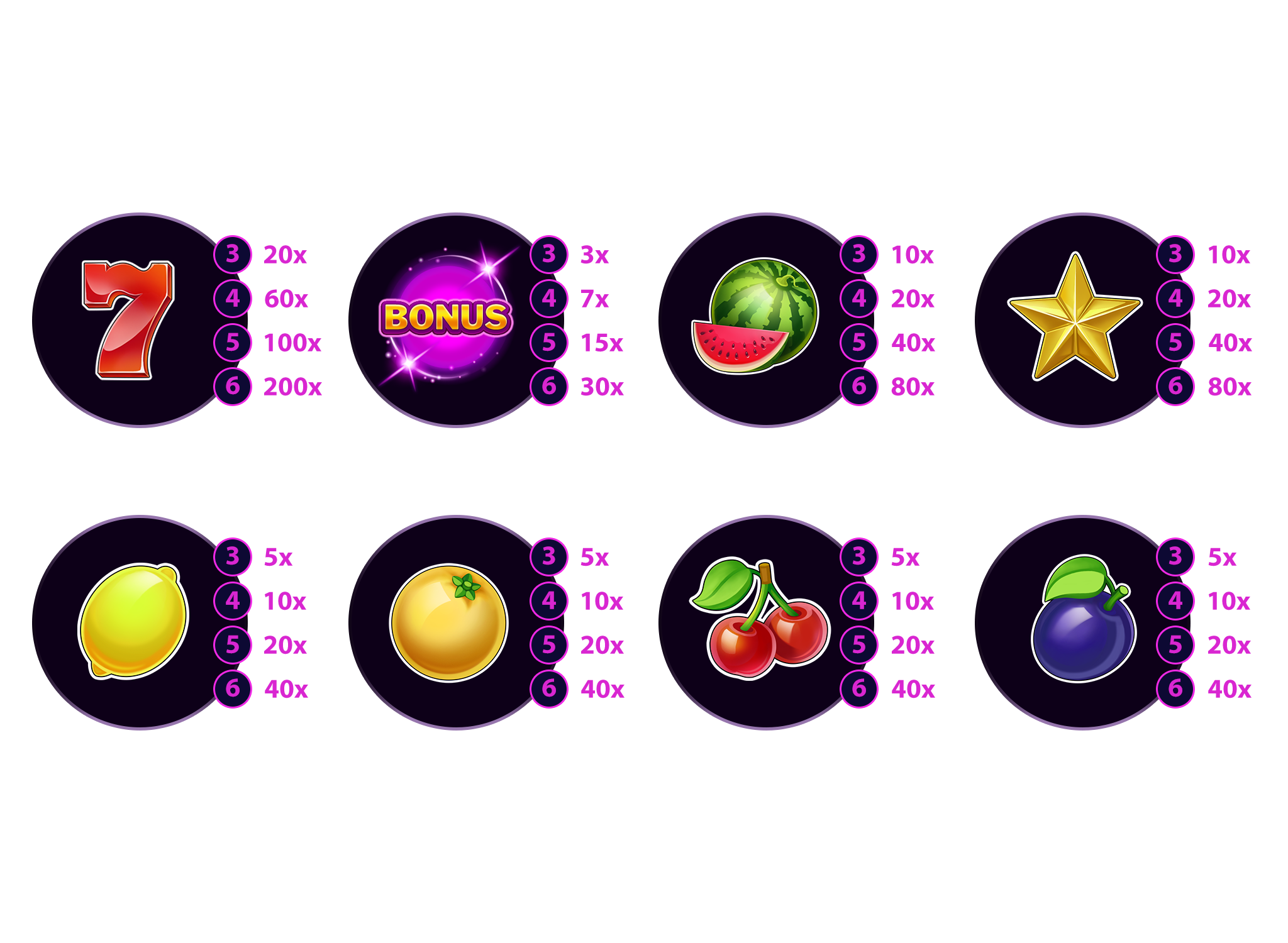 Cheeky Fruits 6 Royale is a 6 reel, 3 row video slot. The game is played with 5 bet lines (fixed). All line wins pay from left to right starting from the leftmost. Symbols must land on consecutive reels.